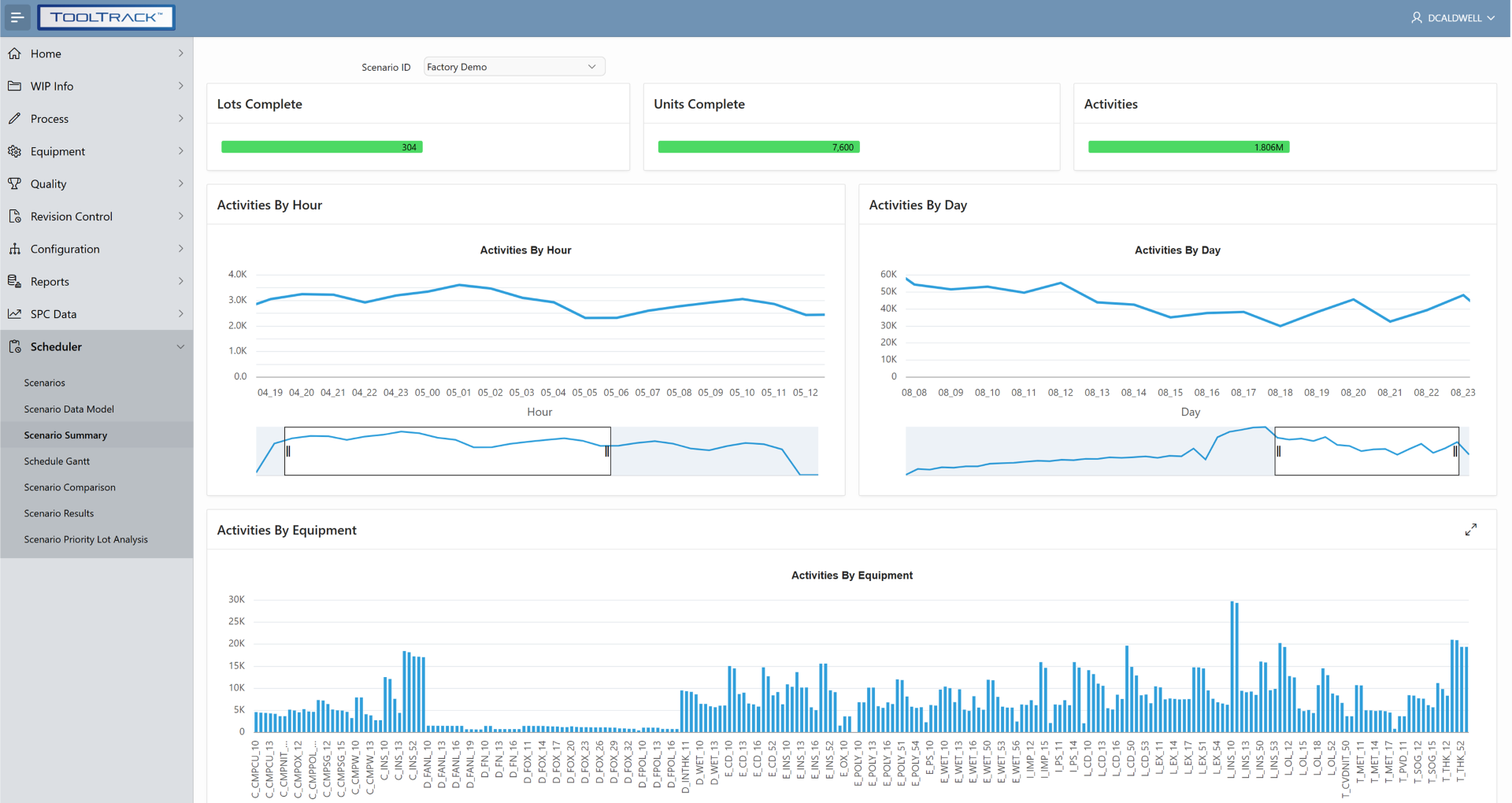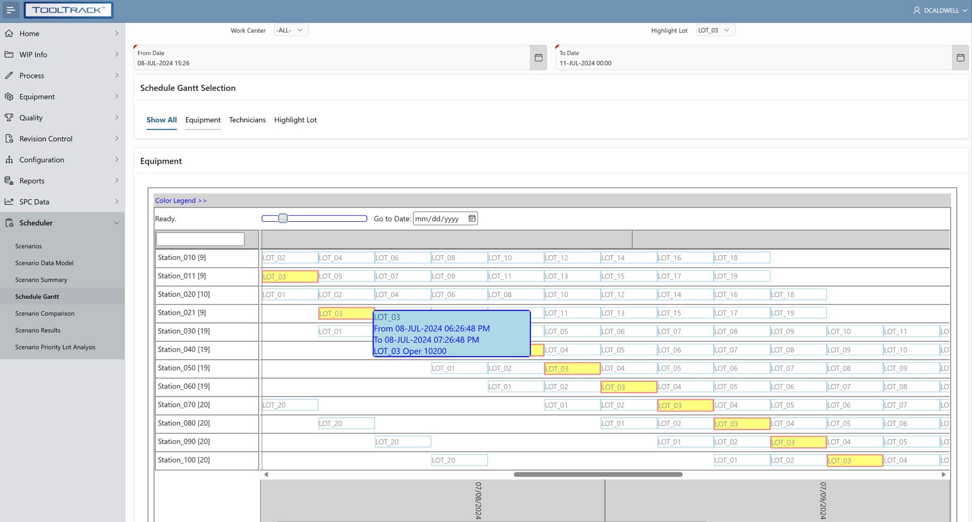 Tactical Scheduling allows factory managers to fine tune a methodology for driving to specific manufacturing goals. Big shipment in 6 weeks? Want to make sure your bottleneck equipment is always busy so you don't starve the back end of the production line? The ToolTrack Scheduler pegs all activity in the factory down to the minute, and makes sure the right material is being processed at the right time (on the right equipment) to achieve your goals. Material going on hold? Important experiment being designed? Equipment maintenance coming up? No problem! ToolTrack Scheduler takes all of that into account and constantly reacts to changing conditions automatically.